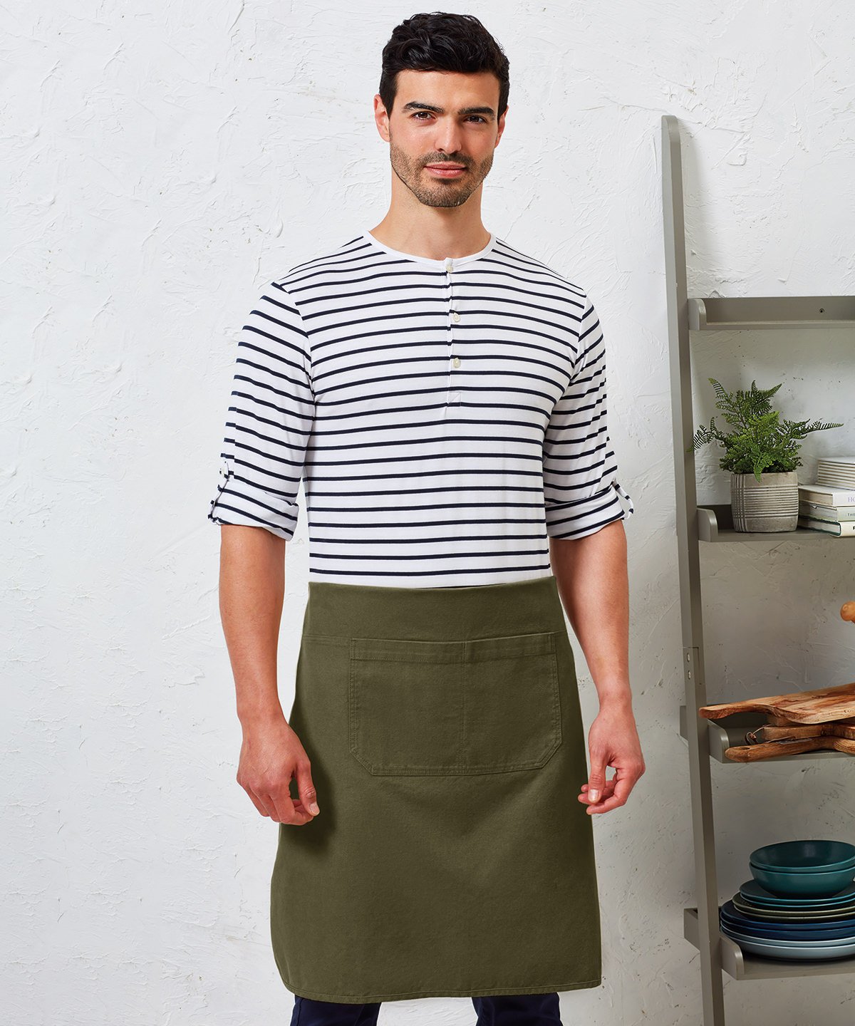 This artisan-inspired apron is designed so it can be worn in bib or waist style. Rounded edges create soft lines, whilst the eyelets provide an industrial-chic feel. Adjust the overall height with a knotted neckband and store your essentials in the double centre pocket. The heavyweight canvas is a durable fabric that looks and feels premium, making this the perfect apron for any venue passionate about their trade. Made with certified recycled polyester.