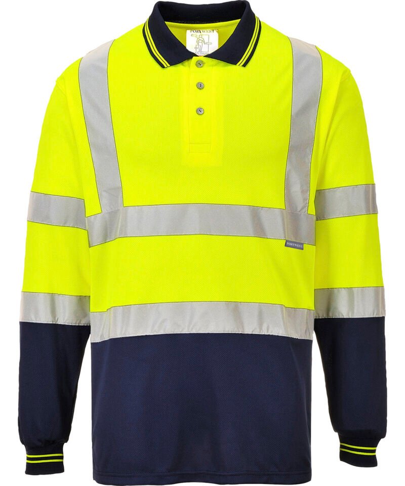 This style combines all the benefits of our best selling long sleeve polo with the additional feature of two-toning for even more practical benefit. The polyester bird eye knit material used is breathable light and comfortable.