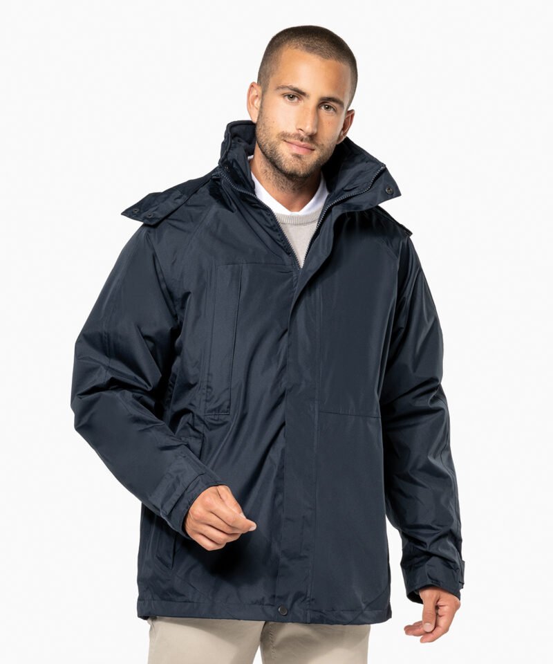 100% Polyester outer with PVC coating. Water-resistant taped seams. 3-in-1 parka: dual-composition padding. Body: 100% polyester mesh. Sleeves: 100% polyester. Zip fastening and press stud placket. Fleece-lined neck. 3-zip pockets at the front with flap. Tear release adjustable cuffs. Press stud removable hood with mesh lining and stoppers. Inner zip access for decoration. Fleece jacket: 100% microfleece polyester. 100% polyester sleeve lining for easy removal. Zip fastening. 2 side pockets. Fleece jacket detachable by zip. BSCI certified.