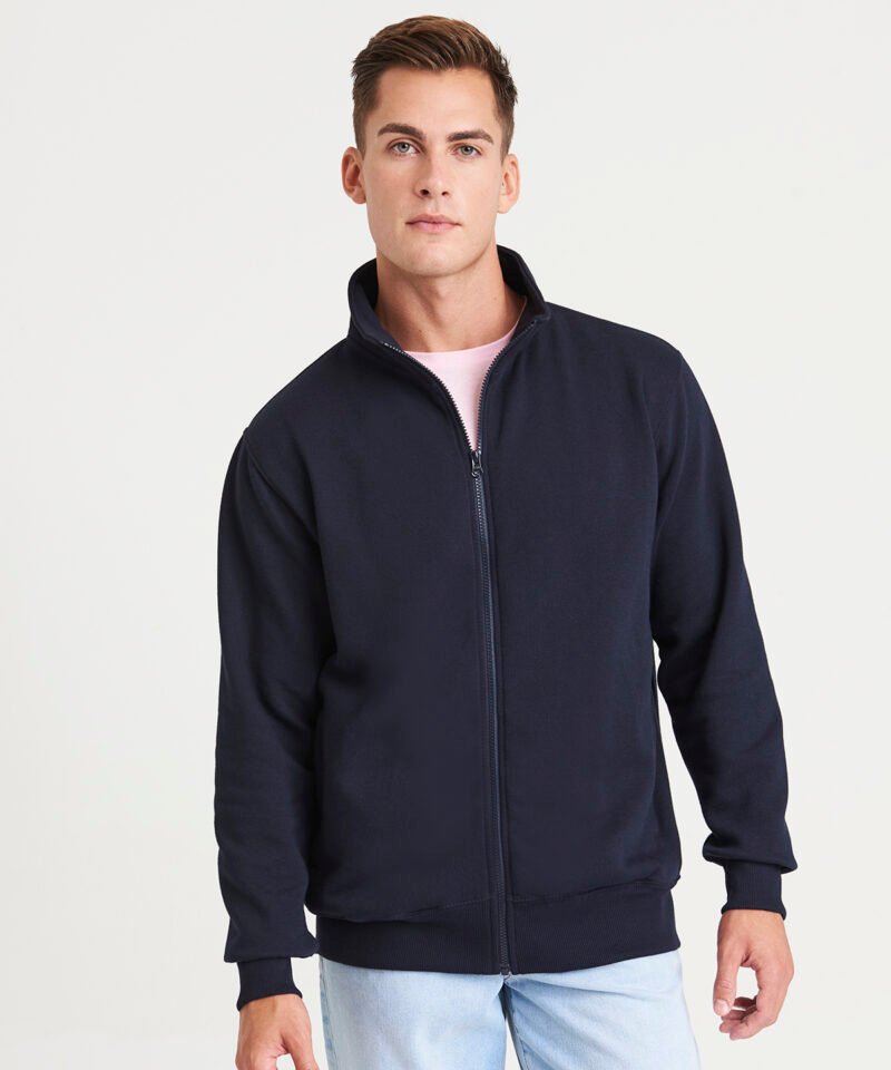 Full-zip sweatshirt. YKK plastic zip. Ribbed side panels. Ribbed cuffs and hem. Brushed inner fleece. Soft cotton-faced fabric creates the ideal printing surface. Simple tear-out label makes it perfect for rebranding.