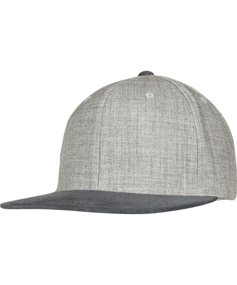 Melange velour snapback. Retro style. Mottled outer fabric. Soft-contrasted, flat visor. Integrated snapback closure.