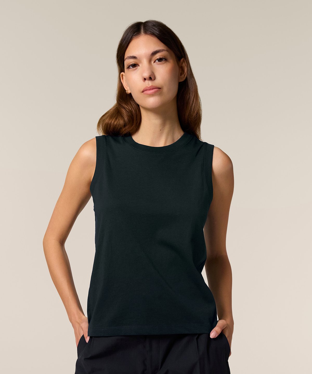 The Stella Mia tank top for women. Medium fit. Sleeveless. 1×1 rib at collar and armhole. Back neck tape in self-fabric. Twin-needle topstitches at hem.