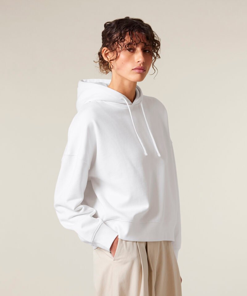 Premium women’s hoodie sweatshirt in brushed 100% organic cotton, 300gsm. Dropped shoulders, adjusted length. Excellent printability.